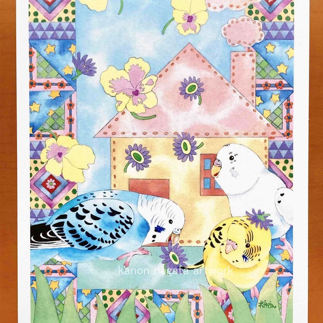 作品タイトル「花が降る家」 透明水彩絵の具で描いたセキセイインコのイラストをもとに、 ポストカードを作りました! 額に入れて玄関やお部屋に飾ったり、 ポストカードとして使用したりと、 楽しんでいただけます。 メッセージを書いてプレゼントに添えたり、 ポストカードをそのままプレゼントしても良いと思います。 【内容】 1枚 【サイズ】 約10×14.8cm 透明な袋に入れて、簡易包装で発送いたします。 【用紙のこと】 手に馴染むようなしなやかな柔らかさと、色鮮やかな印刷が特徴の紙です。 印刷会社さんで印刷しました。(オンデマンド印刷) 【注意事項】 ・納品書は同封しません。