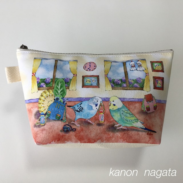 透明水彩絵の具で描いたセキセイインコのイラストをもとに 合皮ポーチを制作しました。 【サイズ】 縦約12cm×横(チャック部分)20cm、横・(底部分)約14cm 底の幅:約7cm ※ポーチ横幅は、チャック部分と底部分で少し違います。