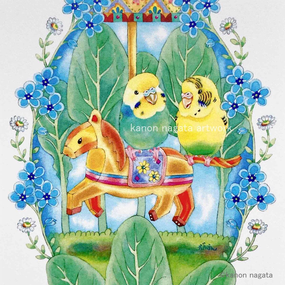 透明水彩絵の具で描いたセキセイインコのイラストをもとに、