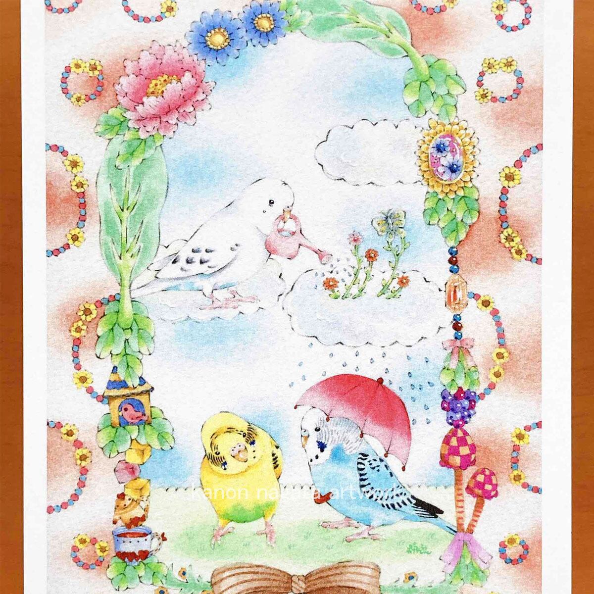 ポストカード「空色セキセイと赤いかさ」