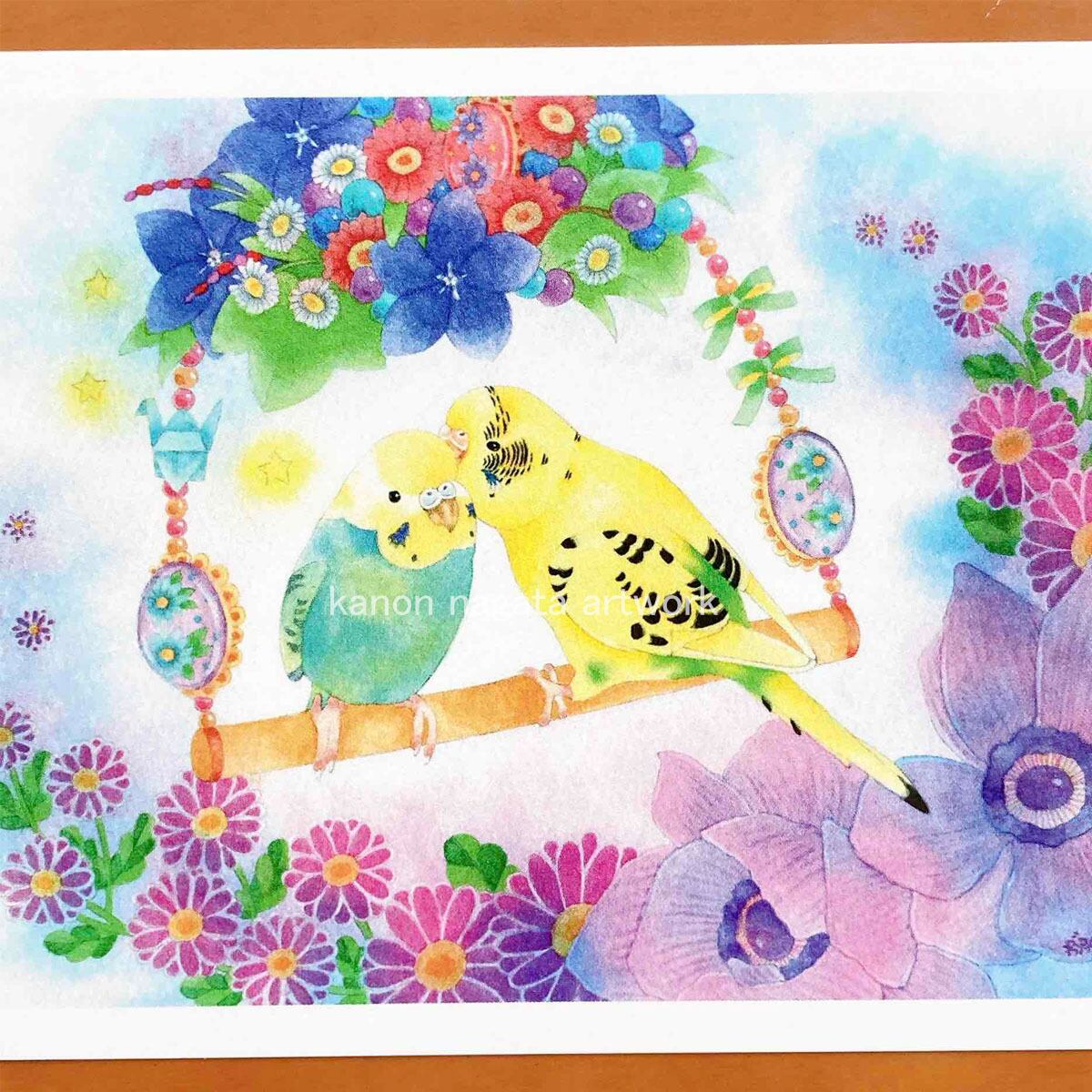透明水彩絵の具で描いたセキセイインコのイラストをもとに、