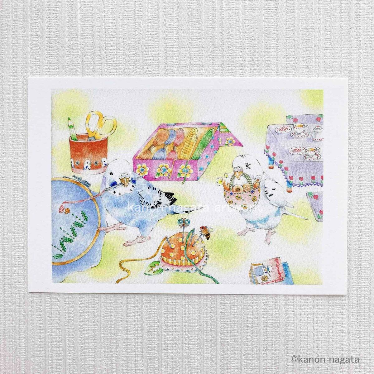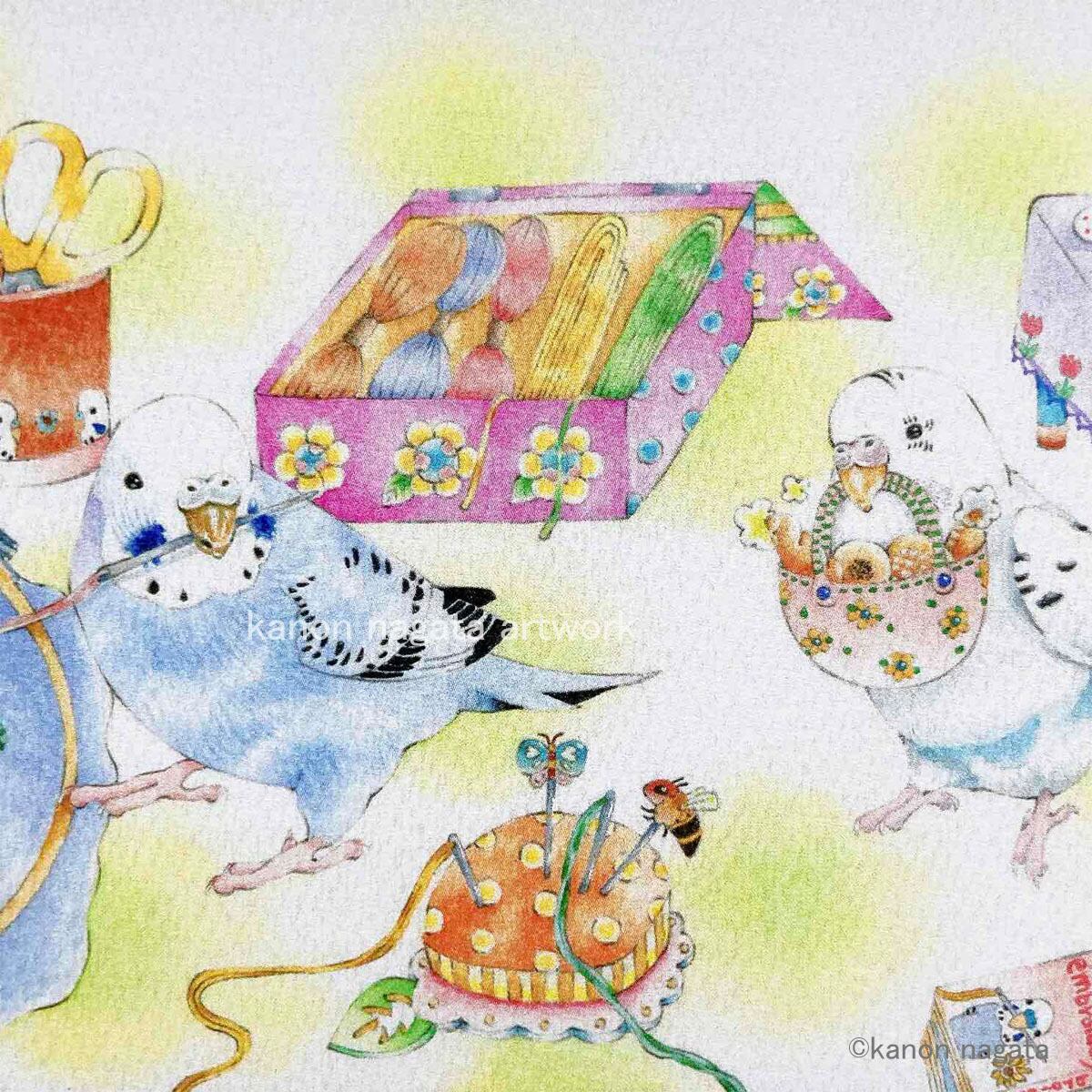 透明水彩絵の具で描いたセキセイインコのイラストをもとに、