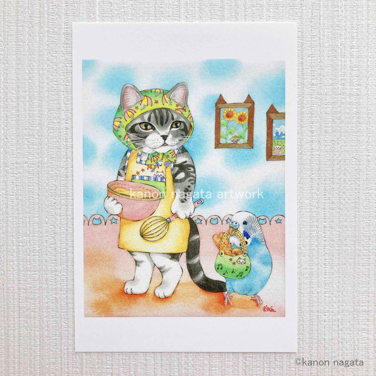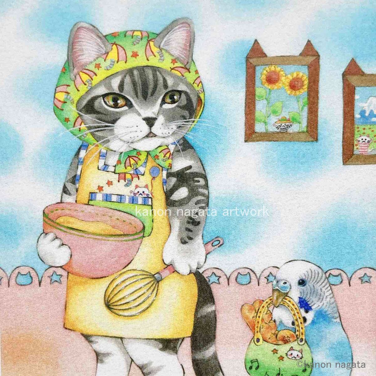 透明水彩絵の具で描いた猫とセキセイインコのイラストをもとに、