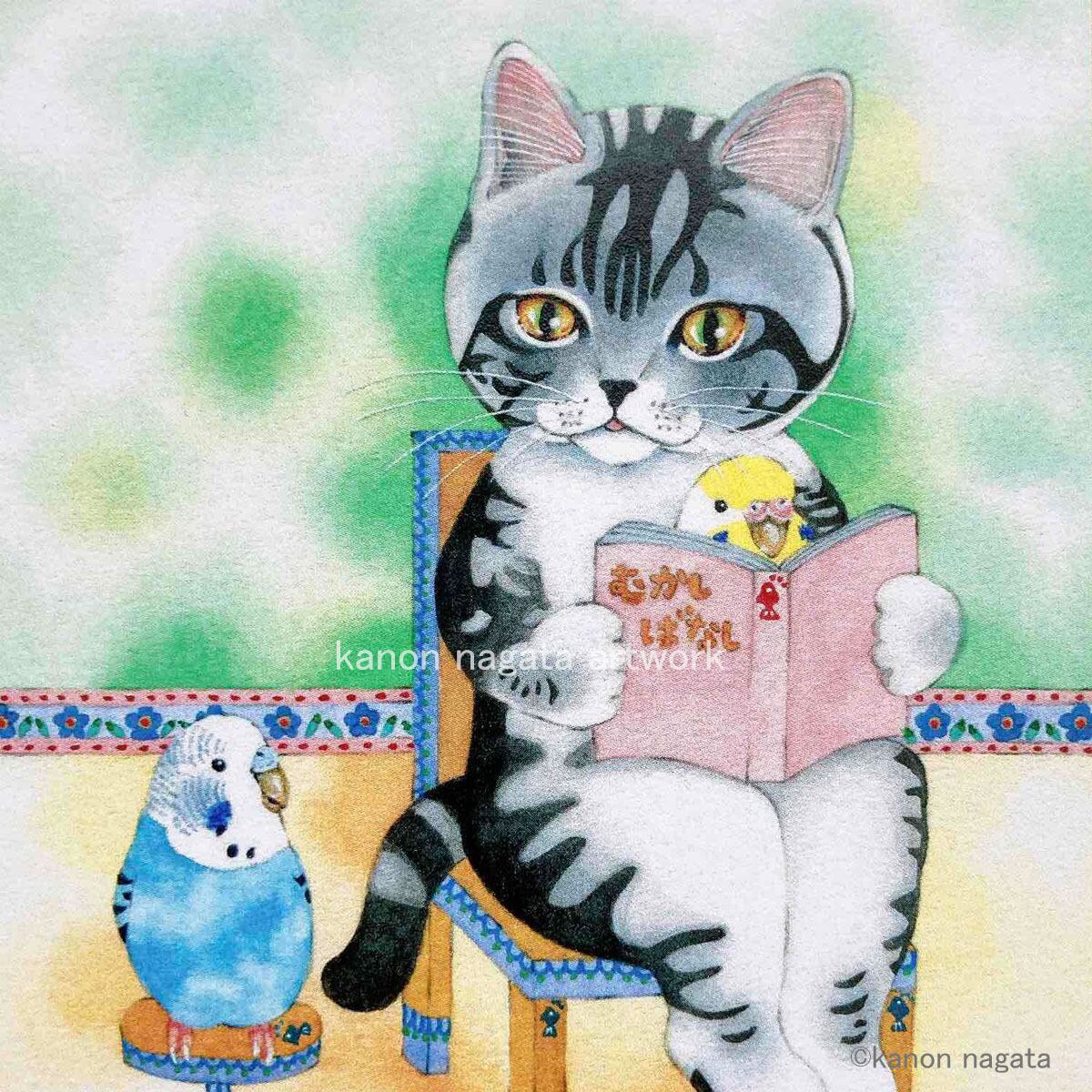 透明水彩絵の具で描いた猫とセキセイインコのイラストをもとに、
