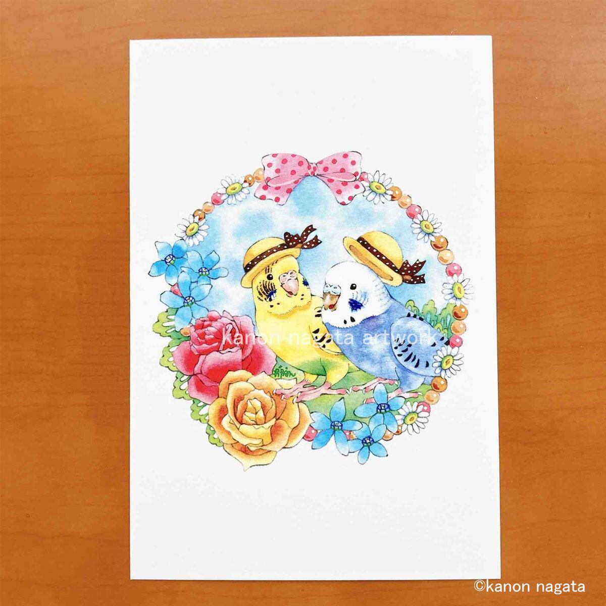 透明水彩絵の具で描いたセキセイインコのイラストをもとに、
