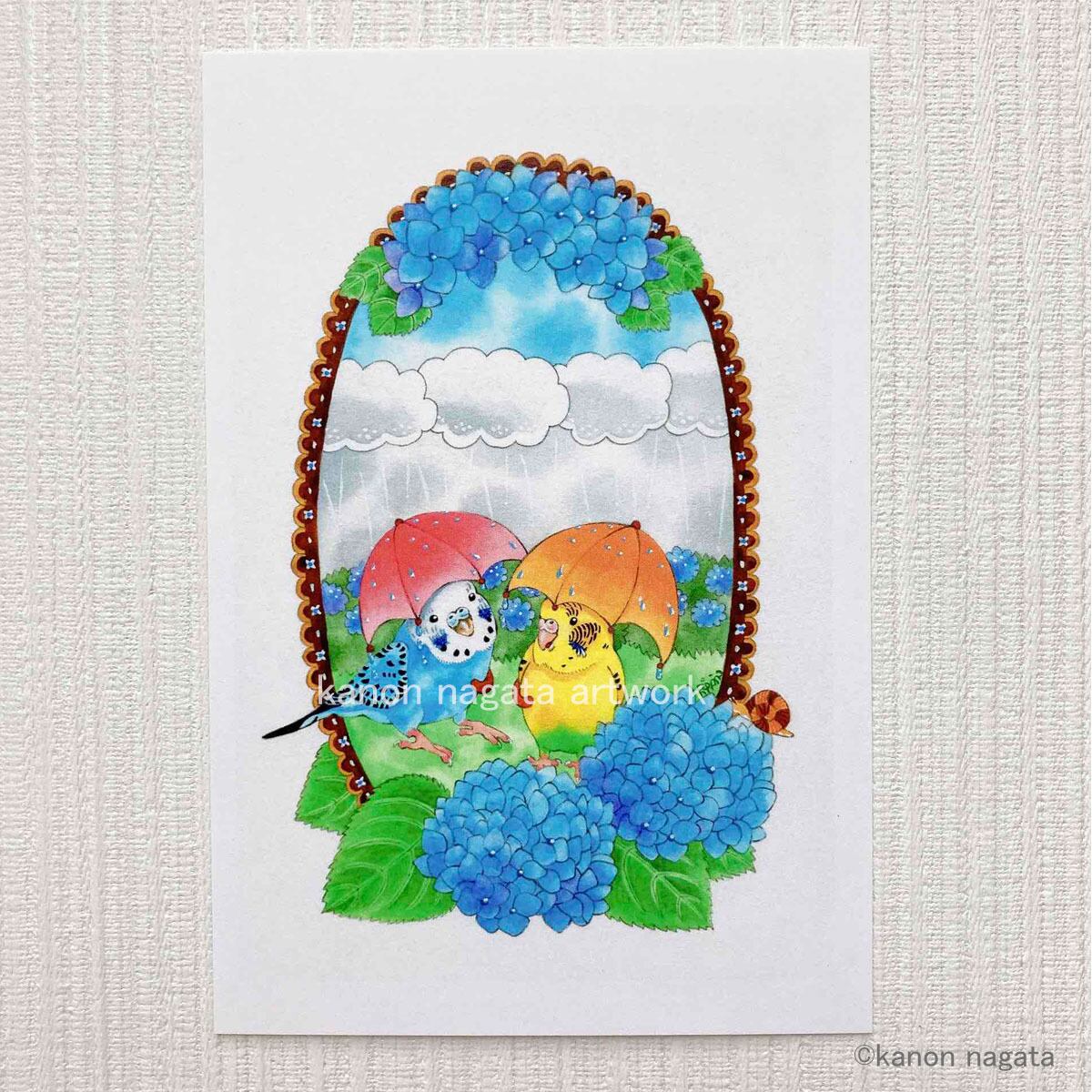 透明水彩絵の具で描いたセキセイインコのイラストをもとに、