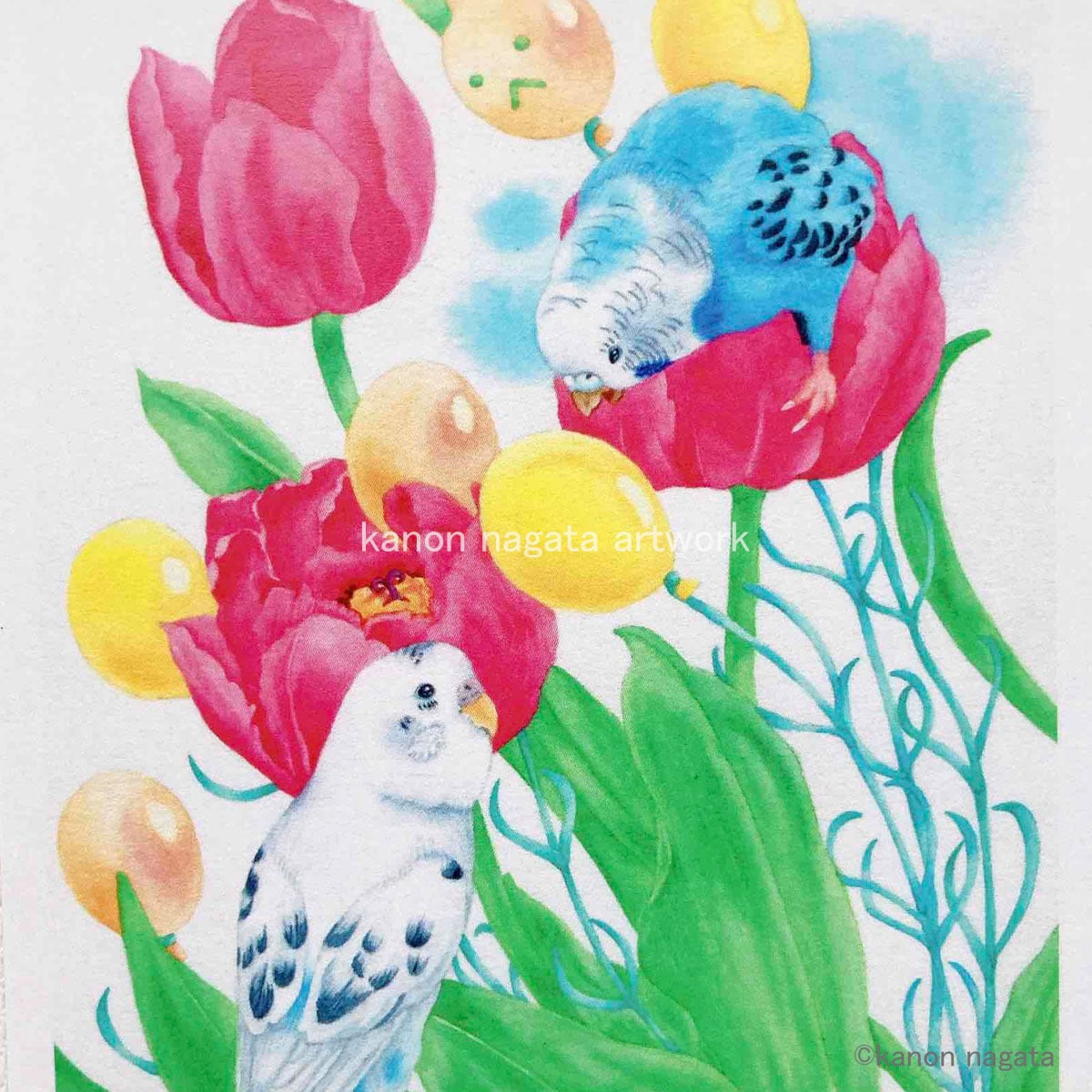 透明水彩絵の具で描いたセキセイインコのイラストをもとに、